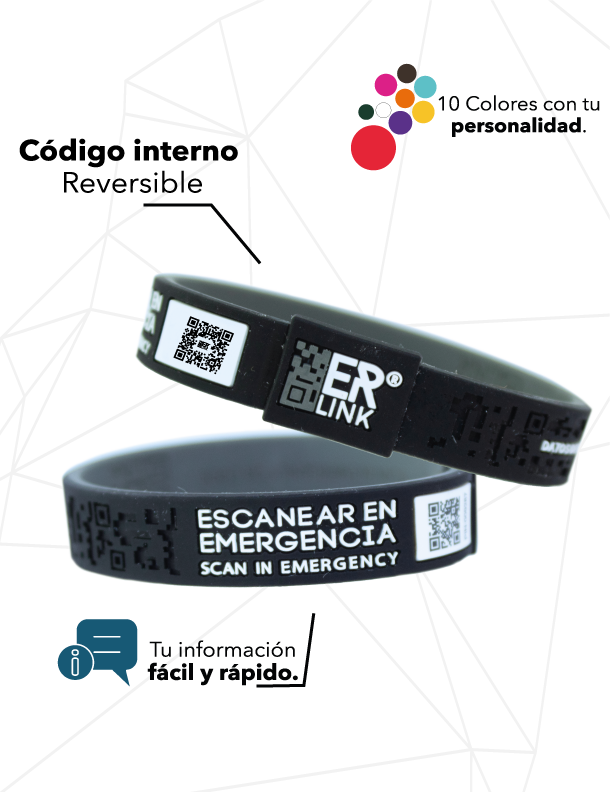 Material: Hipoalergénico, resistente al agua y duradero. Tamaño: 5 tallas para adaptarse a diferentes tamaños de muñeca. Color: 10 diferentes colores para combinar con tu gusto y personalidad.. Fabricación: Hecho en México Diseño: Ergonómico para proporcionar comodidad absoluta, su innovador diseño bicolor te ofrece opciones: un lado vibrante para destacar y otro lado más discreto en tono oscuro. Instrucciones: En ambos lados cuenta con la leyenda “Escanear en emergencia” o "Scan for Emergency". Código